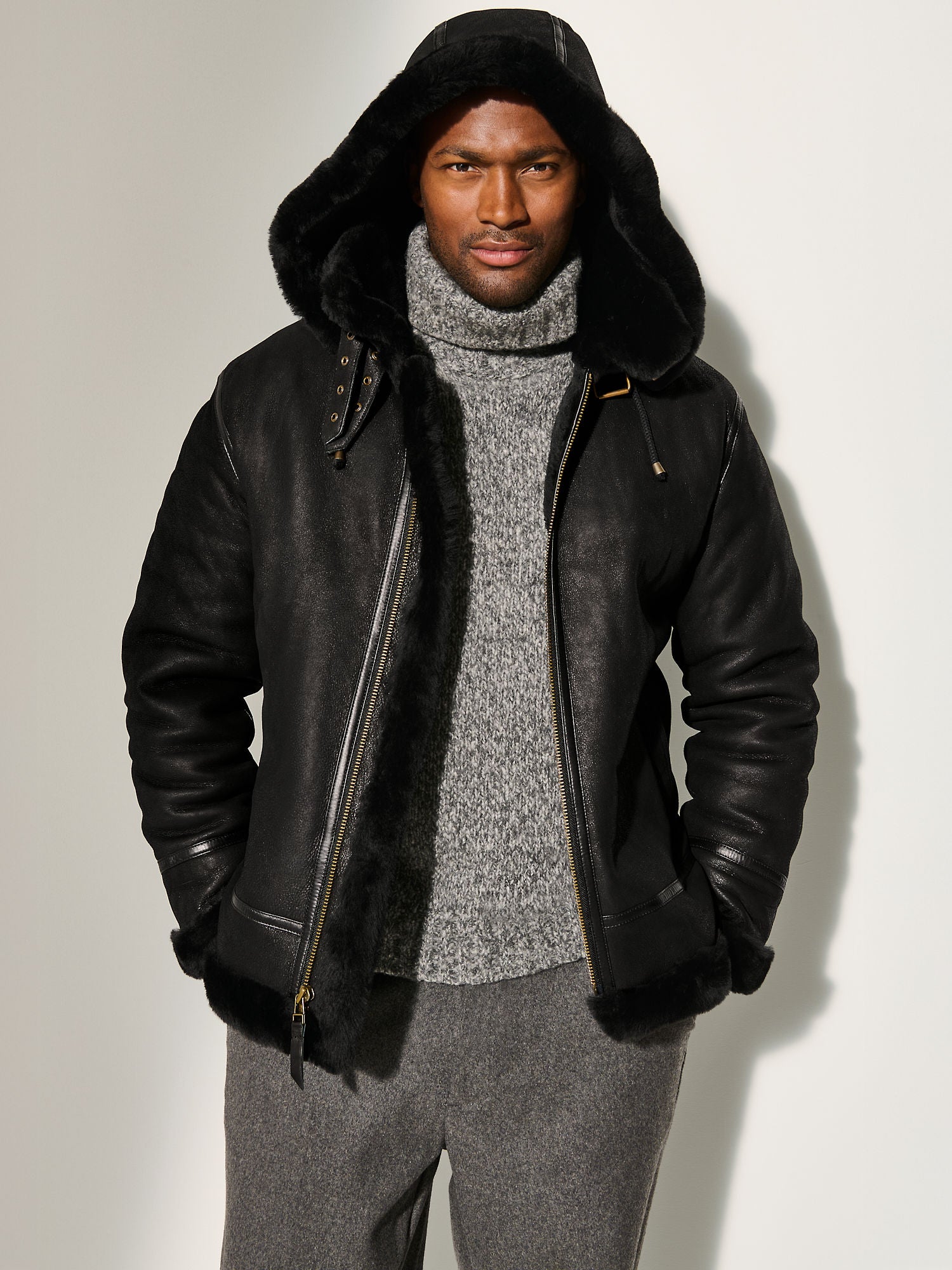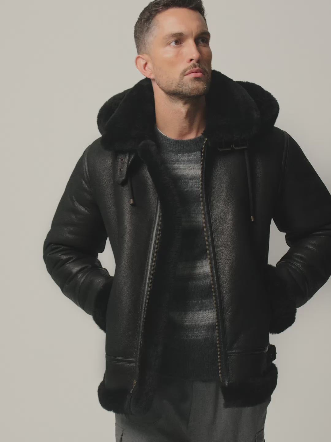 Designed with an authentic aviator silhouette, this men’s shearling bomber includes a detachable hood for versatile styling. The high-quality YKK front zipper ensures durability, while two side pockets provide practicality and everyday convenience. The plush warm fur lining enhances comfort, making it ideal for harsh winter conditions.