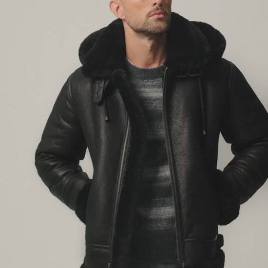 Upgrade your winter outerwear with this Men Classic Black B-3 Bomber Aviator Detachable Hooded Sheepskin Suede Leather Jacket, crafted from premium genuine sheepskin for superior warmth, durability, and rugged style. Featuring a sleek black suede leather exterior and soft black fur shearling lining, this B-3 bomber jacket delivers exceptional insulation while remaining breathable and comfortable in cold weather.