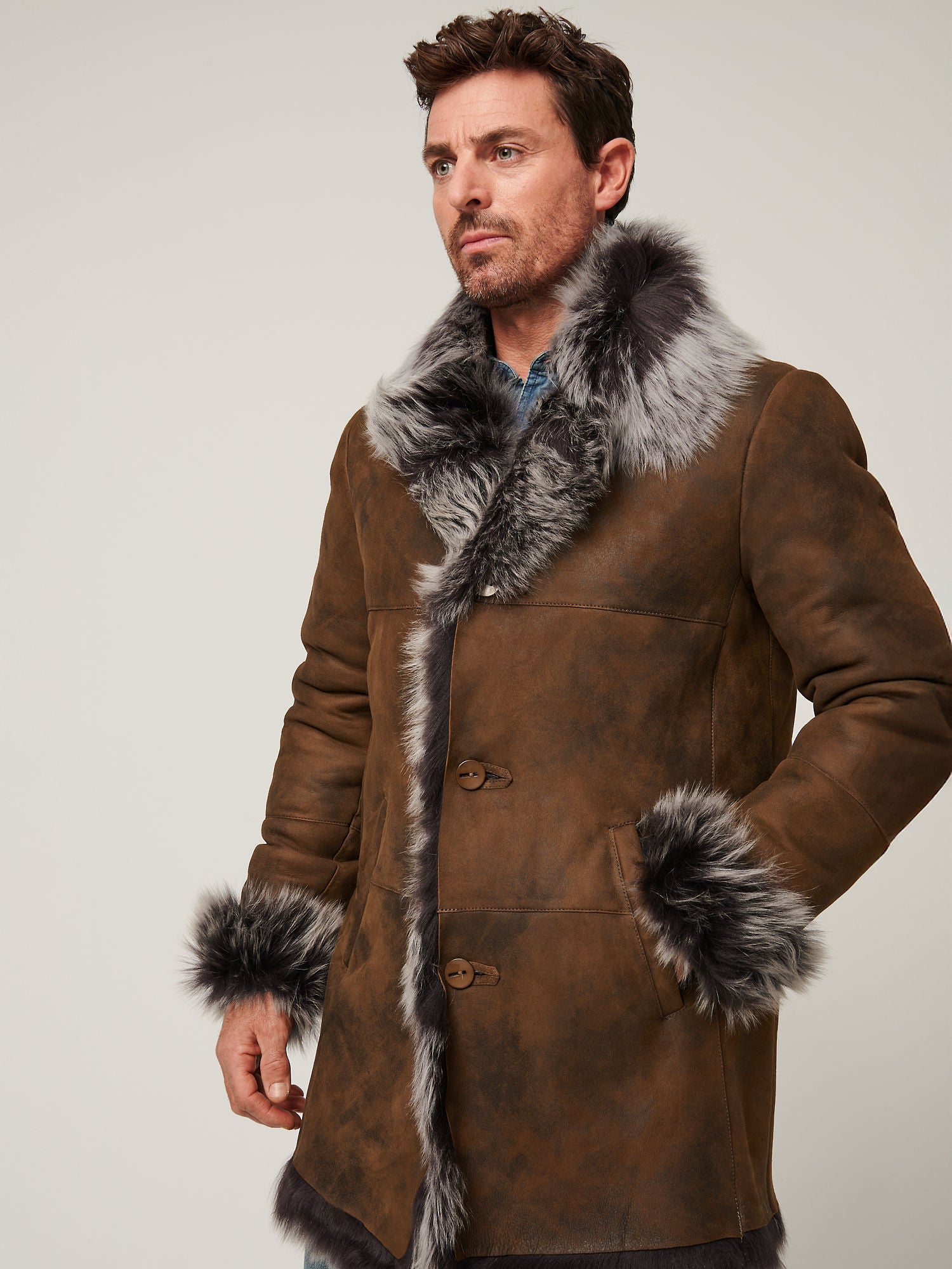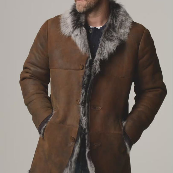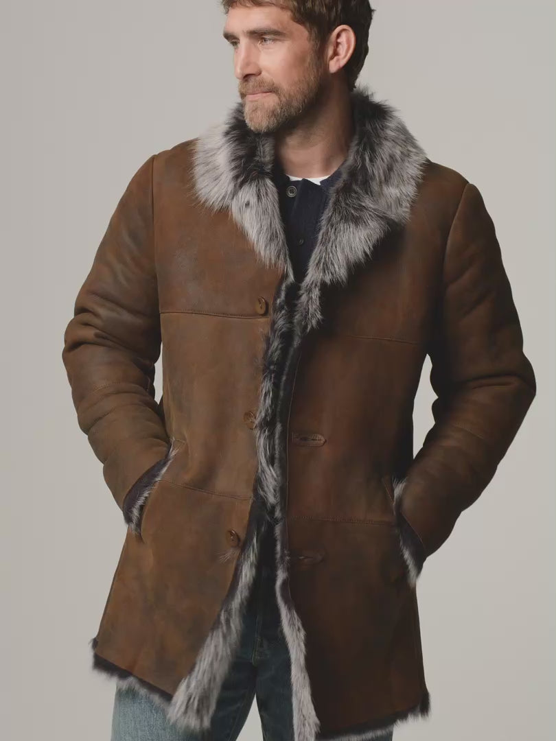 Discover refined winter luxury with this Men Brown Toscana Sheepskin Suede Leather Grey Shearling Fur Coat, expertly crafted from premium genuine sheepskin for warmth, durability, and timeless style. The rich brown suede exterior pairs perfectly with a soft grey Toscana shearling fur lining, delivering superior insulation and breathable comfort during cold weather.