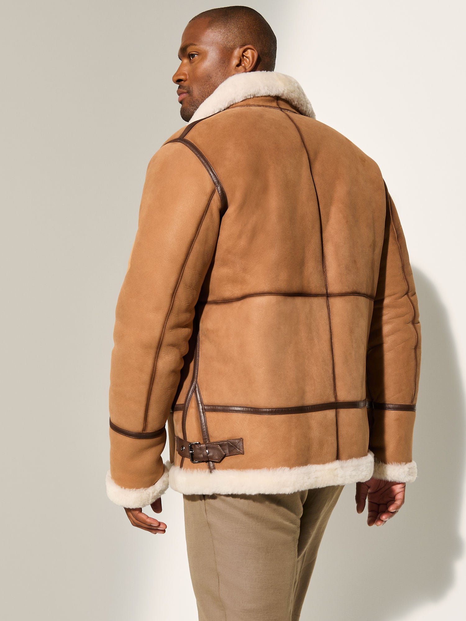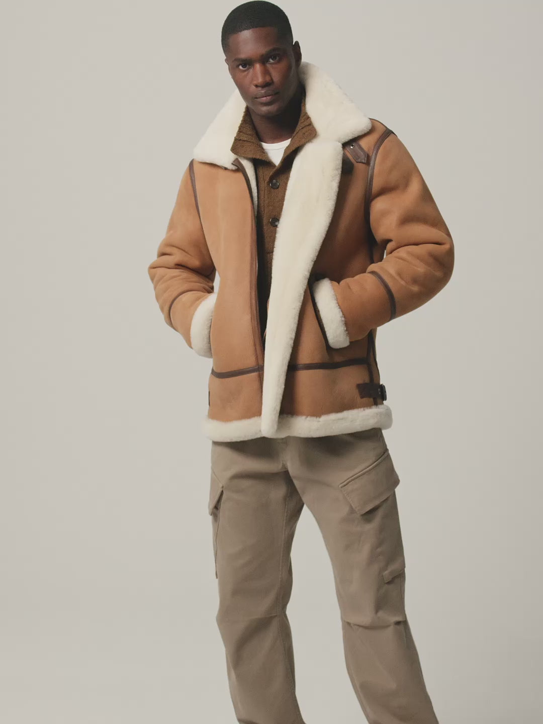 Elevate your winter wardrobe with this Men Camel Brown Jason Aviator Sheepskin Leather Coat. Crafted from real sheepskin leather with a soft plush white shearling fur lining, it delivers exceptional warmth and comfort. Designed with a YKK front zipper, fur-trimmed collar and cuffs, and two practical side pockets. The hip-length vintage aviator silhouette blends rugged heritage style with modern luxury appeal.