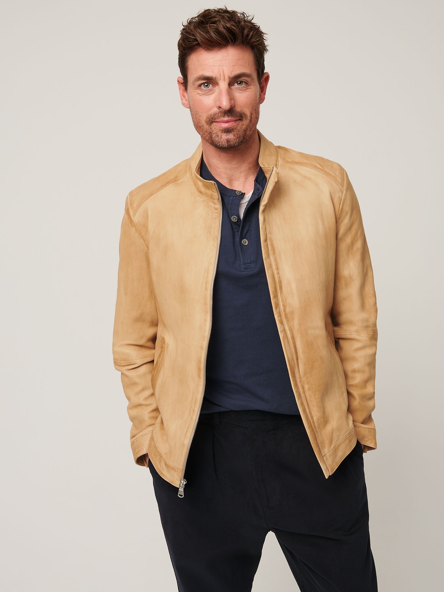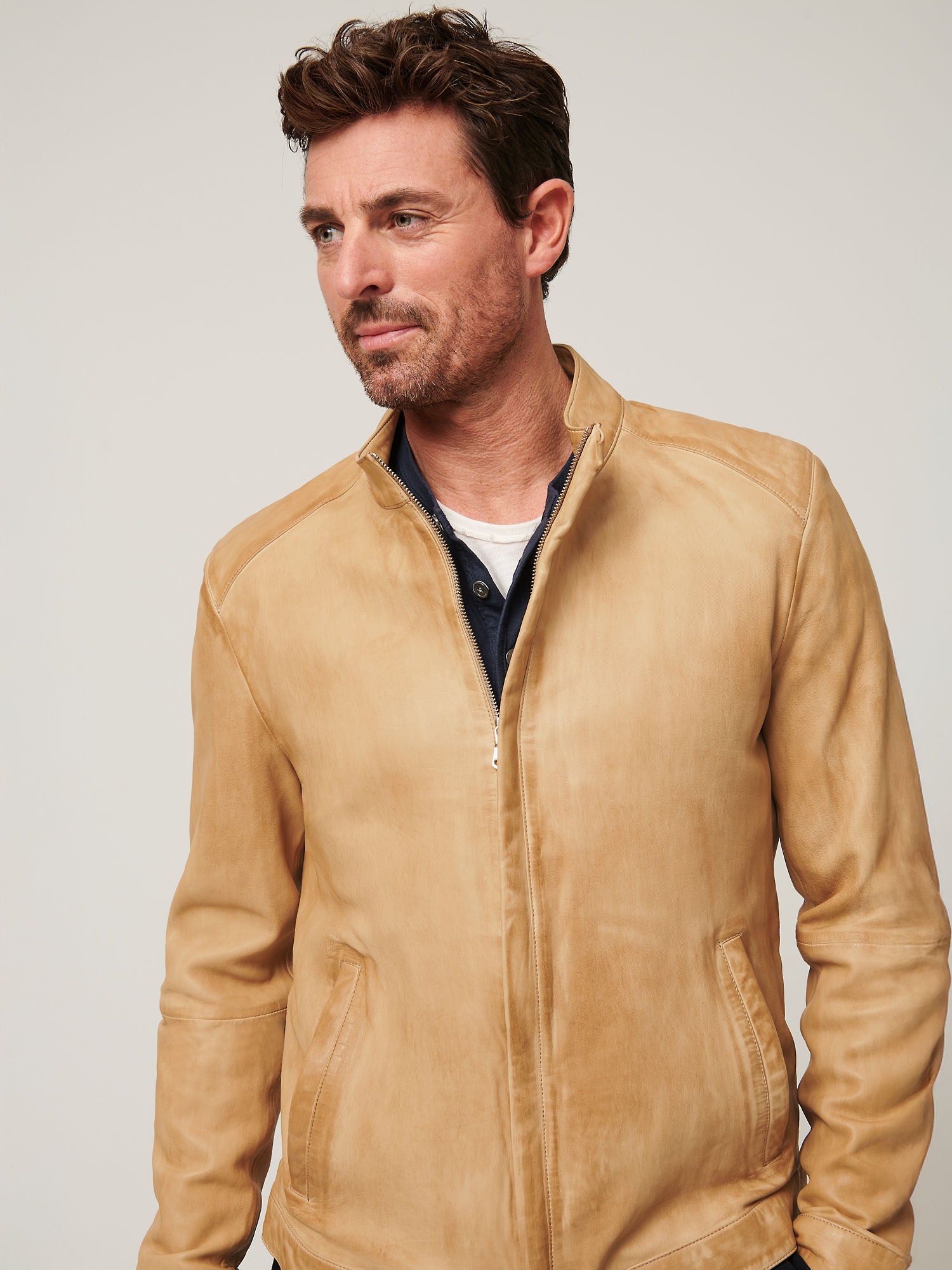 Durable stitching, premium finishing, and attention to detail reflect true craftsmanship. Whether layered over a T-shirt or styled with a button-down shirt, this beige suede jacket delivers confidence, comfort, and timeless style.