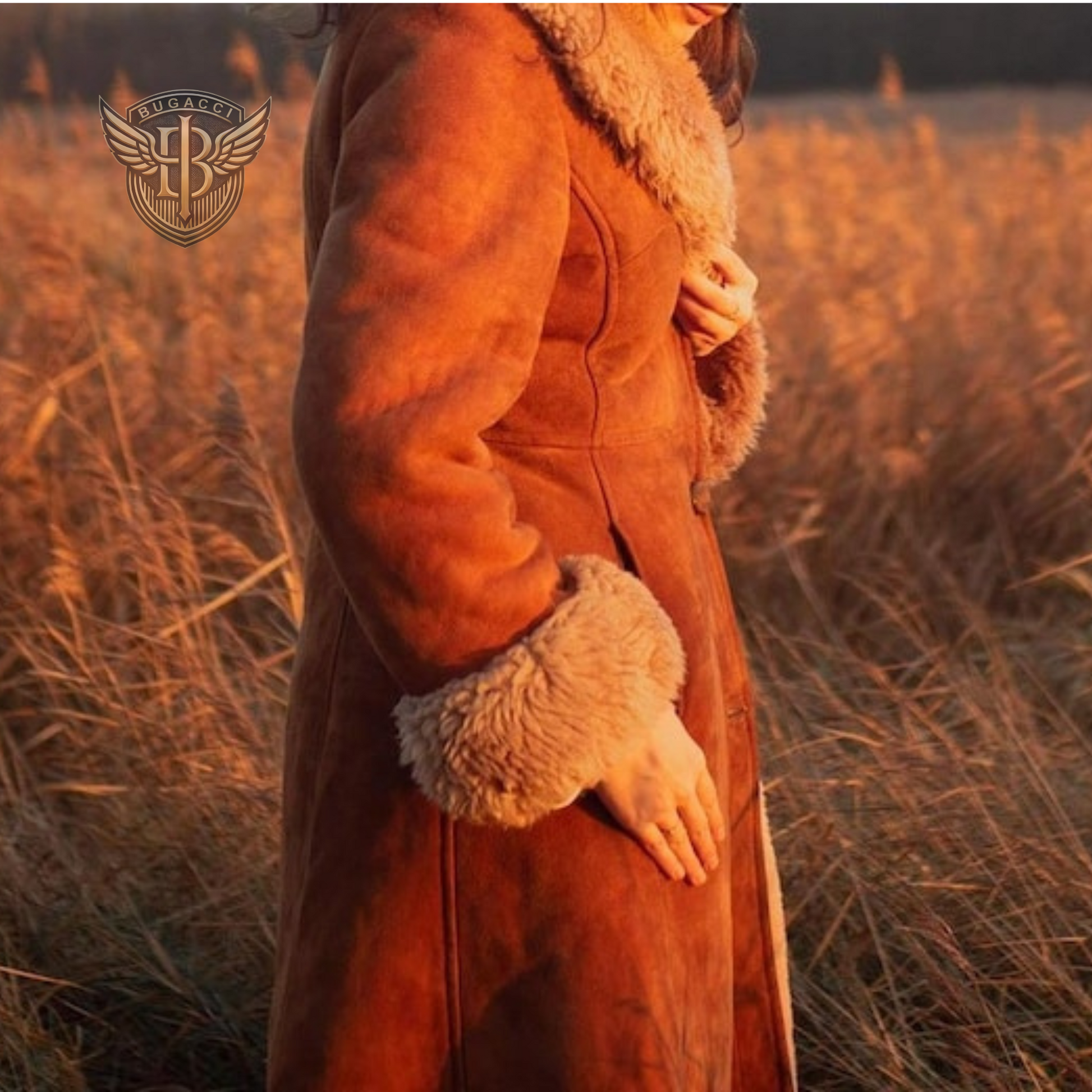 Crafted from premium honey brown sheep suede leather, this coat embodies timeless vintage elegance. The light brown faux fur lining with golden brown cuff and collar trim adds warmth, comfort, and a touch of luxury.
