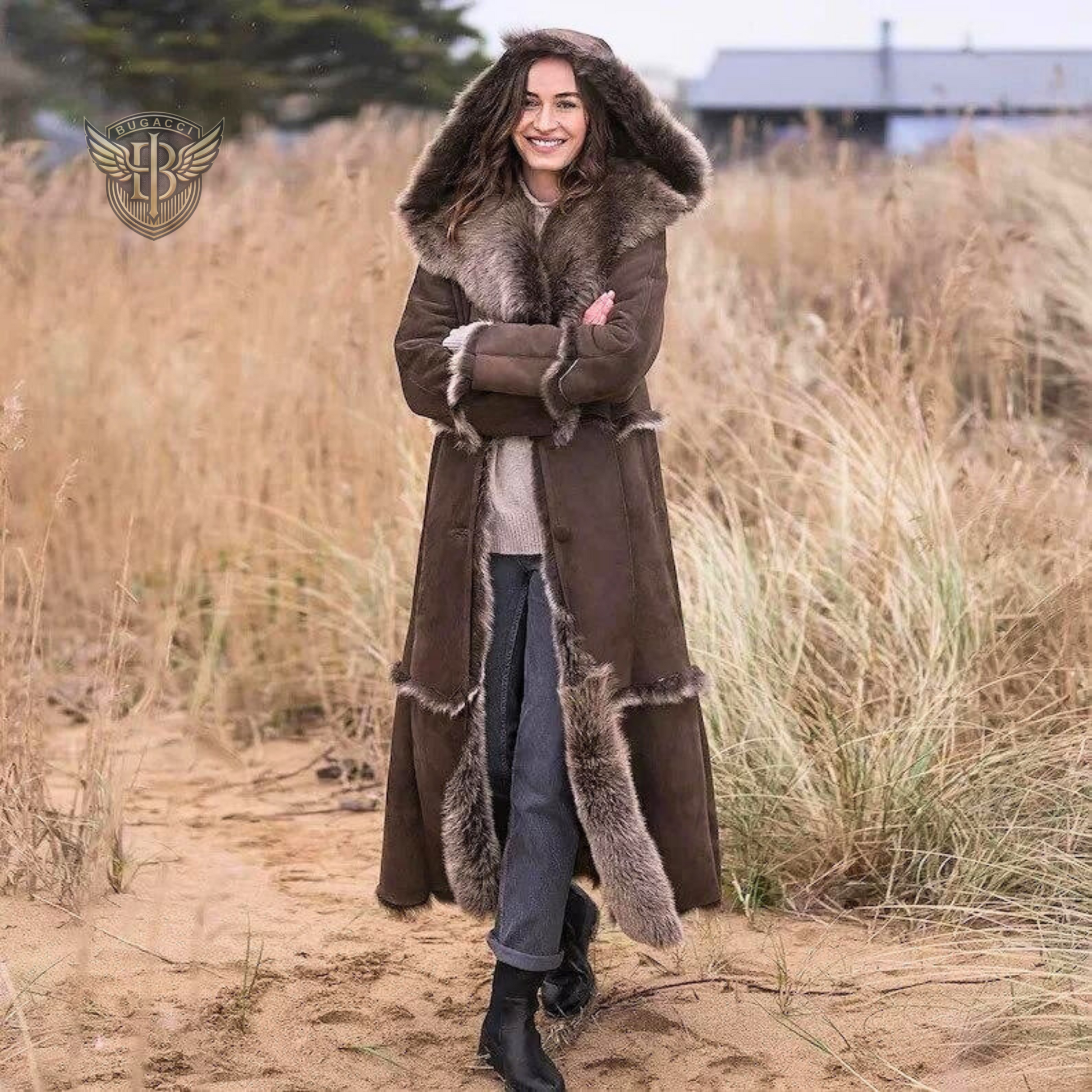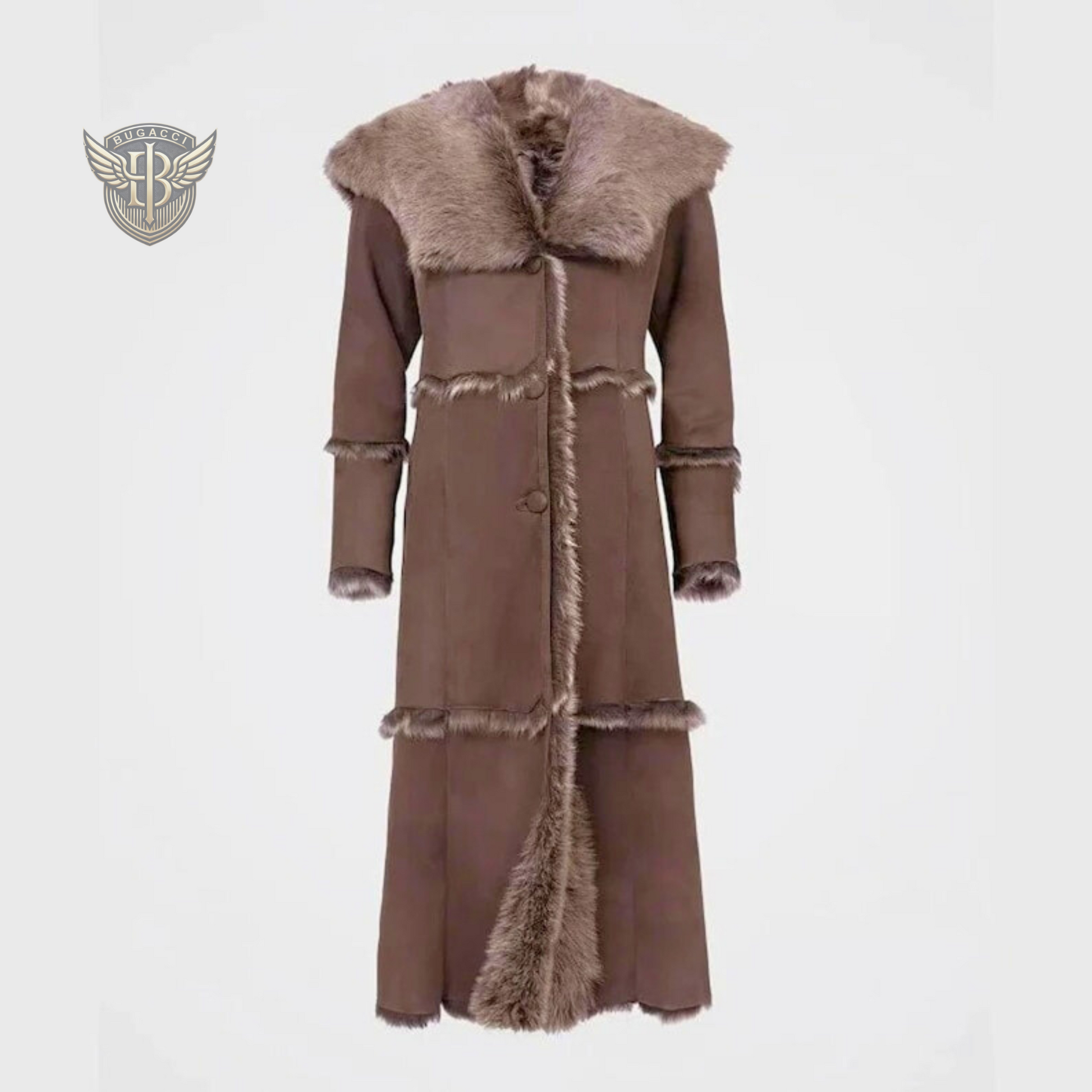 Step into timeless fashion with this 70s Retro Hooded Penny Lane Long Coat, crafted from luxurious sheep suede leather for a classic vintage look. Designed in a rich dark brown tone, this coat features a plush faux fur lining, with matching faux fur trim on the cuffs and hem, offering both warmth and sophistication.