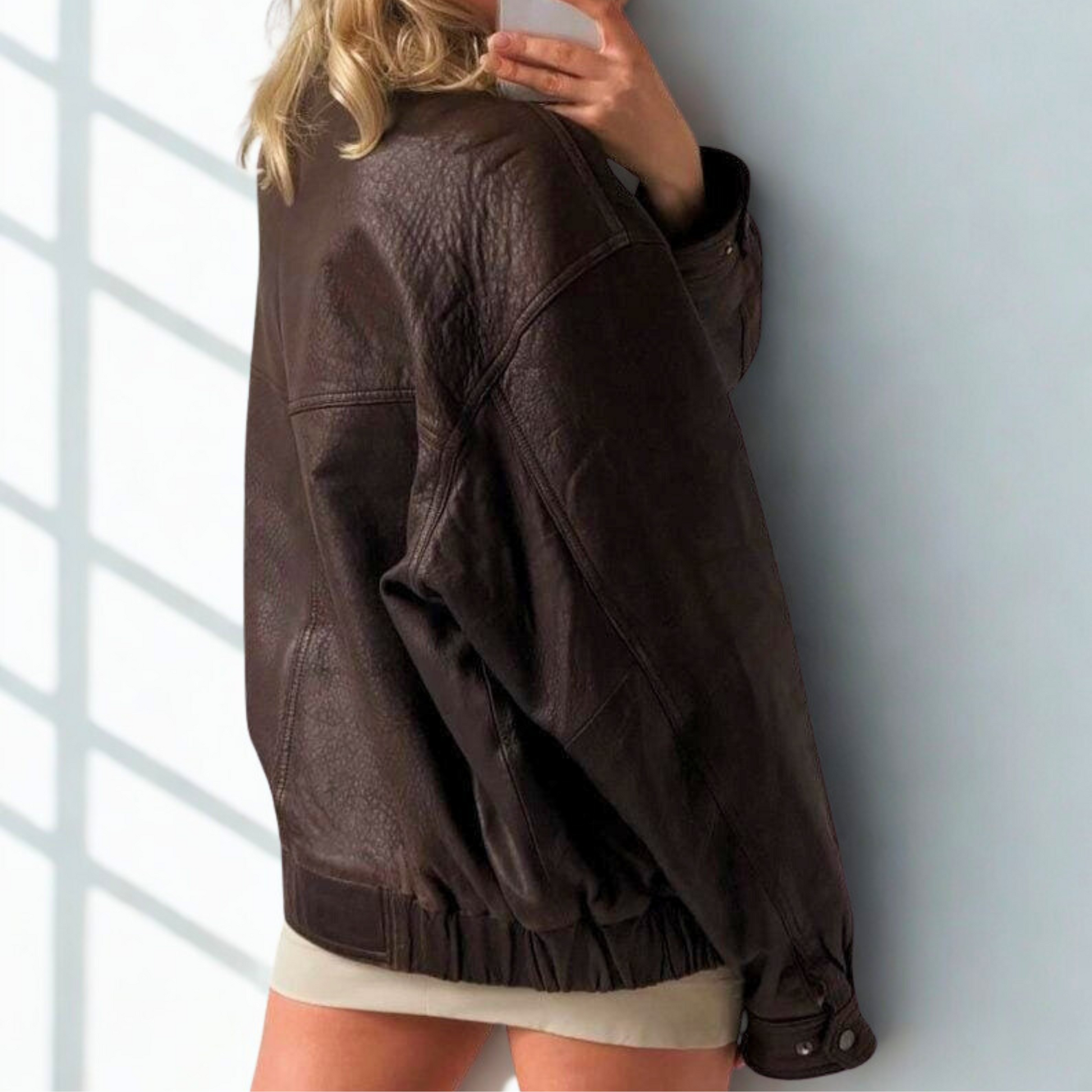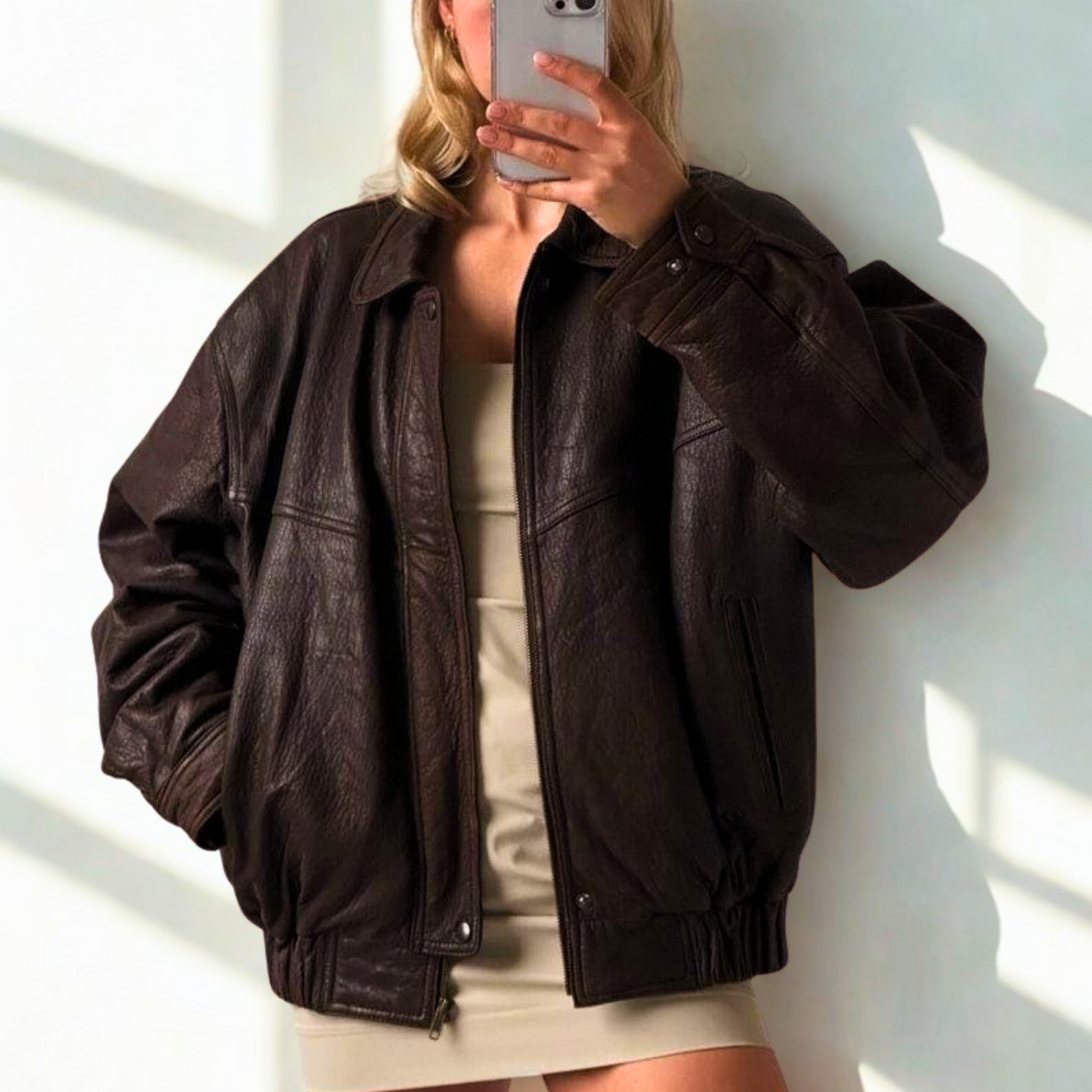 Women's Vintage 80s Oversized Brown Leather Bomber Jacket – Handmade Gift