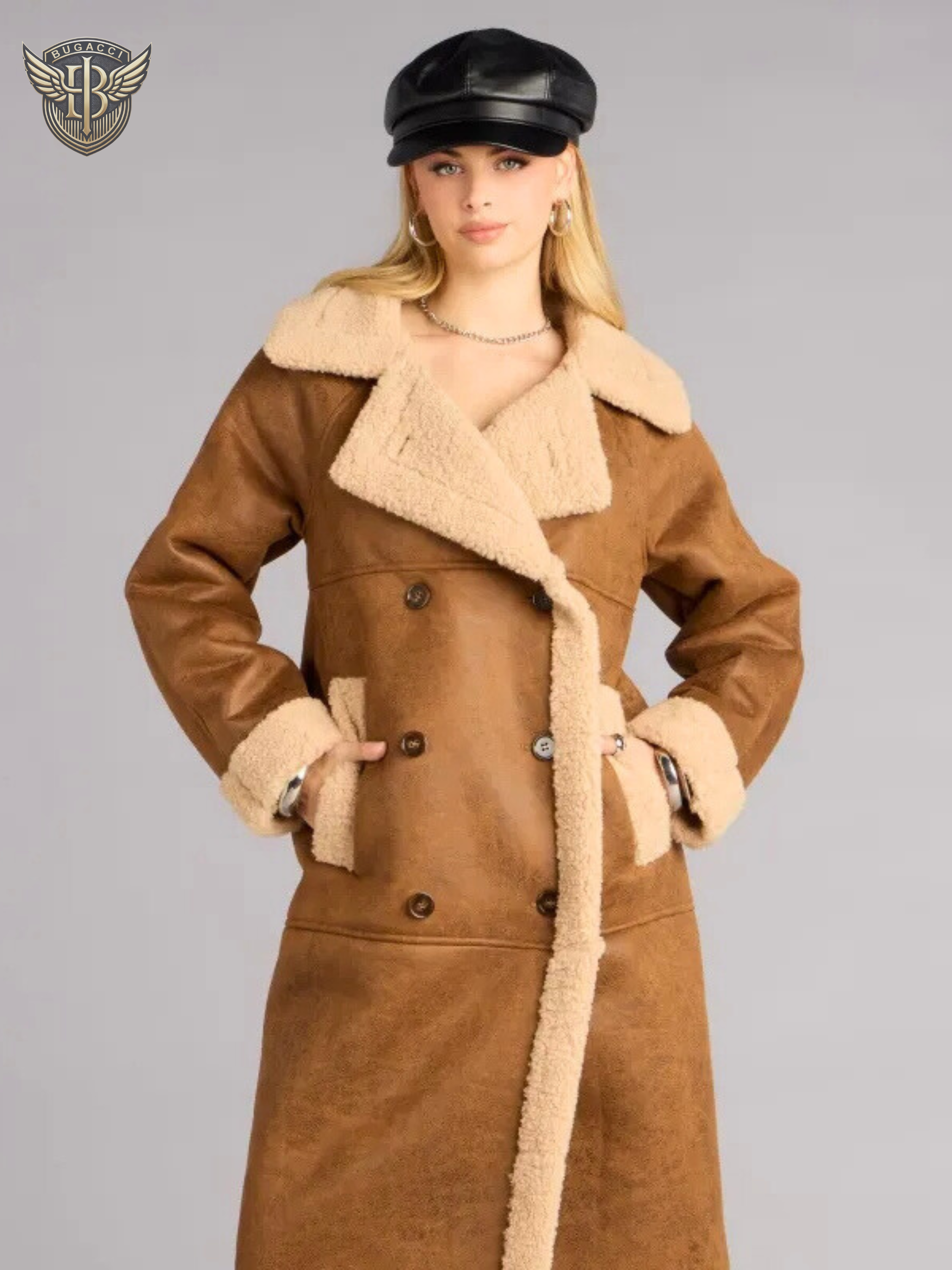 Women’s Brown Sheepskin Shearling Coat – Double Breasted Real Fur Leather Midi Winter Coat